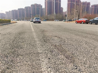 3月22日,记者前往东丽区,探访跃进北路与方山道交口路段。该道路为双向八车道,车流量大。记者在现场看到,跃进北路临近路口地段出现明显麻面,仿佛缺失一层沥青,平整度大幅下降。在左转掉头区域及中间第二条车道,分布着多处坑洞,恰好位于主车道上,车辆途经此处避无可避,只能碾坑通过。对向车道也存在类似问题,双向通行均受影响。