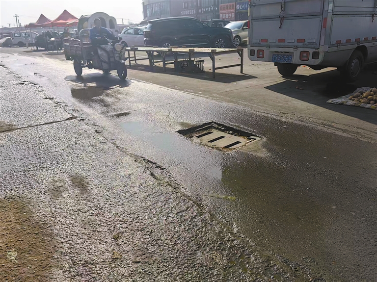 随后,记者驱车来到小淀镇秀水馨苑北侧的小淀路。这段道路两侧是卖菜摊位,早晚高峰时段人车流量大,也是不少居民出行的必经之路。记者在现场看到,该路段多个井盖塌陷严重,部分路面出现塌陷。由于人车混行,破损点位避无可避,安全隐患突出。周边商户介绍,此类情况从去年就已出现,已有不少行人在此摔倒。