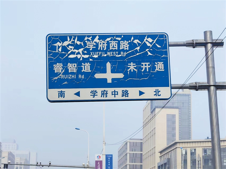 市民赵先生反映,西青区才智道上一交通指示牌漆皮破损,希望相关部门抓紧更换或修复。文/摄 记者 胡智伟