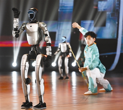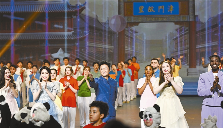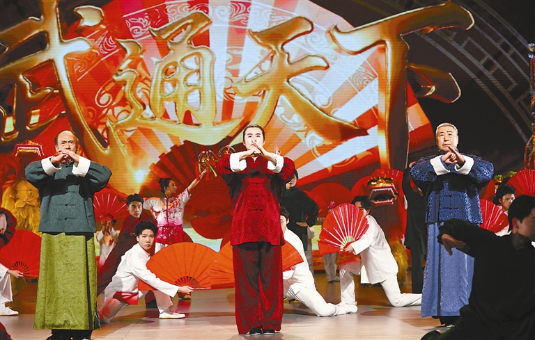 开篇篇章《源起华夏·武承千载》中分别上演了《鼓震炎黄》《甲骨武韵》和《太极万象》,武术少年们在一招一式间感受着祖先的智慧。这里,不仅是武术的起点,更是中华文明的精神原乡。随后的《流润津门·武传天下》篇章中,《津武相融》《武脉赓续》和《武通天下》娓娓道来津门大地与武术的渊源。在这里,“闪电手”张占魁融合形意八卦,韩慕侠传道授业,霍元甲精武报国,一代代武术大师以其开放包容的胸襟,使天津成为武术走向世界的重要窗口。第三篇章《百川共流·千邦同武》则展现了《雅韵流芳》《侠趣萌心》,吉祥物“武小侠”率领一众“小功夫熊猫”登场,令人忍俊不禁。天津武术名将杜洪杰在随后的《智武乾坤》中闪亮登场,4名机器人“伴武”让科技与传统碰撞出火花。压轴篇章《和合未来·少年共武》中,在《绿洲载梦》和《同心闪耀》中,运动员们点亮了从天而降的梦想之舟,现场气氛推向顶点。所有演员回到舞台上,同心闪耀。