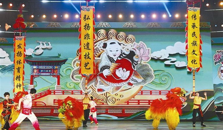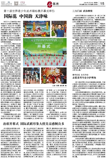 作为开幕式重头戏,文体演出以“国际范、中国韵、天津味”为核心理念,分为4大篇章,600多名演职人员用汗水与热情呈现了一场视听盛宴。负责文体演出的总导演张浩是天津市舞蹈家协会主席、天津歌舞剧院国家一级导演,她和她的团队曾多次执导天津的大型晚会,张浩向记者介绍说,“我们的演员主要来自于天津师范大学、天津体育学院和天津霍元甲文武学校,整体演员大概不到300人。我们最初的创意在春节前就已经完成,把所有篇章的立意、表现情绪和表现形式都沟通好了。但是因为正值寒假期间,3月2日正式进入排练,到今天才整整23天,所以我觉得这些学校的学生都是非常棒的,在这么短暂的时间内排出这么一台高水平、高质量的演出,是导演组、舞美组、服装组、视频组,包括演员这些所有参与人员的通力合作,才会有这么好的呈现。”