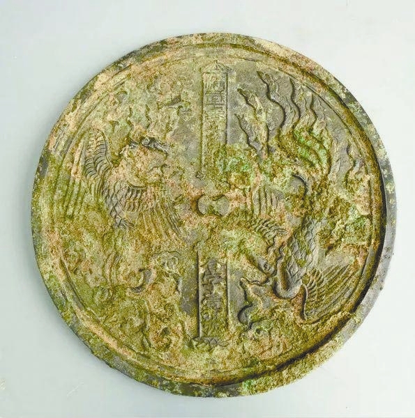 谈到洪武年间的官铸镜,还有一例考古实物资料必须提及,那就是2018年出土于南京市的明代临安公主墓的洪武七年铭双凤纹镜,朱镜静是朱元璋的长女,生于元至正二十年,永乐十九年病死。此镜圆形,元宝形钮,镜缘较窄,素面凸起。镜背主体纹饰为两只浮雕对向鸾凤,长颈大尾,双翅舒张,羽毛刻画精细,身周环绕祥云。镜钮上下各有一长条形方框,上部框中有篆书铭文八字:洪武七年八月日造;下部框中有铭文四字:春字一号。双凤纹镜纪年铭文的制式与字体、尺寸与样式,均与六年龙纹镜相近,为洪武朝初创之镜,皇家官铸,气魄雄浑。