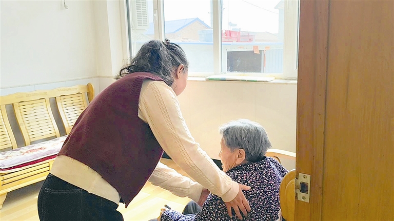 初春的午后,阳光和煦。记者来到田家务村一处宁静的小院里,52岁的黄金花正陪着84岁的养母冯秀晒太阳。她坐在母亲身旁的小凳上,一手轻揽着老人的肩,另一只手拿着木梳,动作轻柔地为养母梳理着花白的头发。