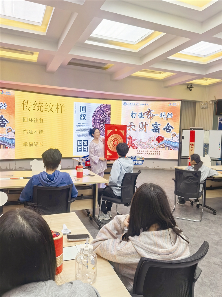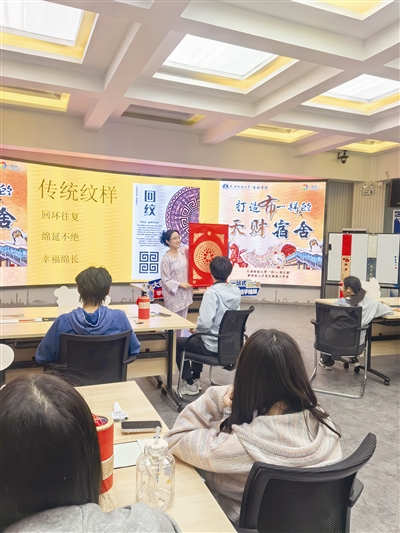 “送东西给耄耋老人,可以选带猫和蝴蝶图案的礼物,这也是古人的‘谐音梗’。”活动现场,肖氏剪布技艺第四代非遗代表性传承人孙肖炜边示范边讲解,从中国传统纹样、传统颜色,到非遗布料处理、制作技巧,生动呈现指尖上的匠心密码。学生们侧耳倾听,随后以“天生我财”为主题创作。选布、画稿、剪刻,手中的彩布在剪刀下逐渐成型。一位女生小心翼翼地展开剪好的作品,眼中闪着光:“原来布也能剪出这么精细的花样。”金融学院学生马靖渝说:“把做好的剪布作品带回宿舍装饰,让传统文化成为日常能看到、用到的物件,这种体验特别有意义。”