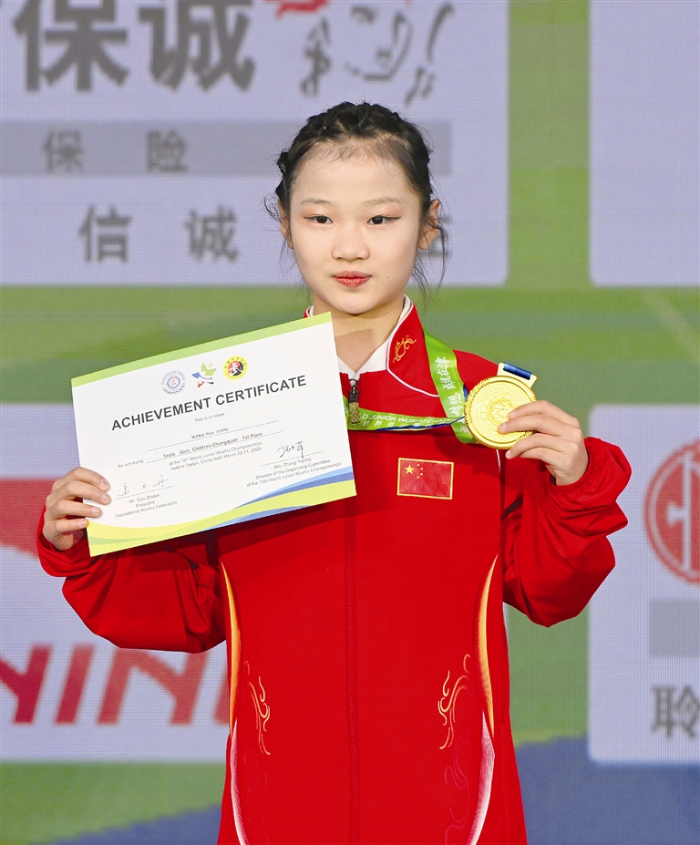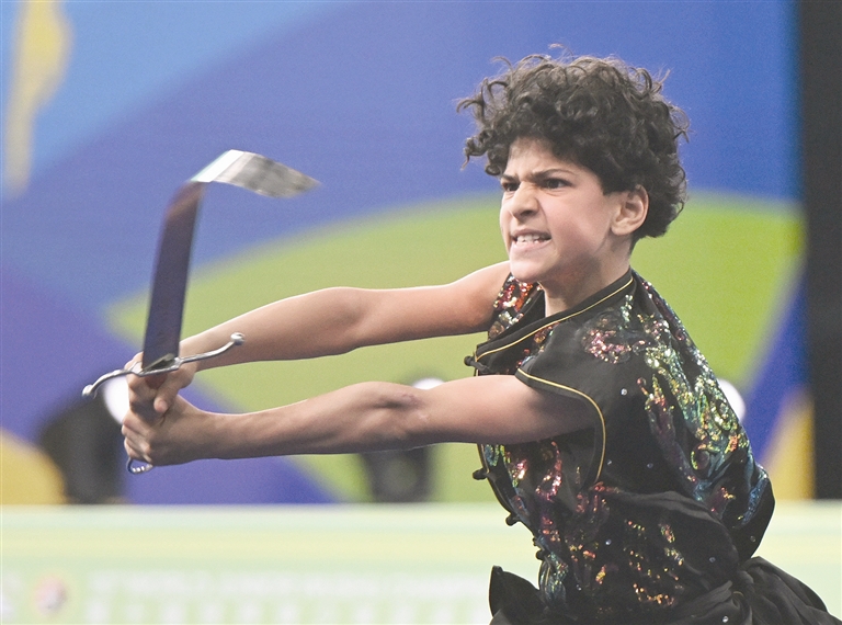 随后进行的女子儿童组(11岁及以下)长拳赛场,中国队小将王艺芮以8.550分的优异成绩夺冠。她的长拳动作规范舒展,弓步、马步扎实稳健,腾空跳跃动作轻盈流畅,整套演练一气呵成,完美展现了儿童组选手的活力与技术功底,为中国队再添一冠。