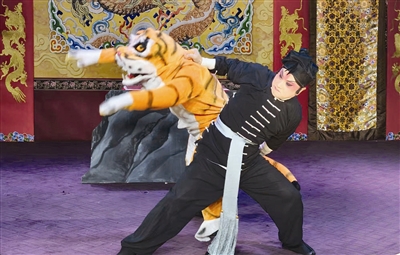 同样是候场,他并非上世纪九十年代初那位面如冠玉、即将提枪上马的“俏罗成”;亦非在天津人艺舞台上活跃30余年,亮相便如一束追光、单纯而青春的“周冲”,或是集市侩、狡诈与卑微于一身的“鲁贵”。此时,上场门的布帘之后,头戴软素罗帽,身穿素侉衣、素褶,腰扎鸾带,足蹬薄底靴,手攥哨棒的他,是即将痛饮十八碗,奔赴景阳冈的打虎英雄——武松。