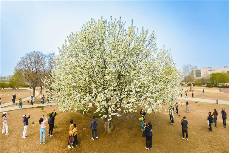 春日的文化中心广场,一株梨树悄然盛放,带火整片园区,吸引市民游客纷纷前来打卡拍照。据悉,这株梨树的最佳观赏期为3月底至4月初,花期仅十余天,成为津城春日里一抹限定的浪漫景致。