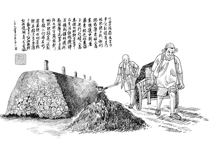 早年间,丁字沽范围内的粪便以及垃圾全由生产队负责清理,然后集中到唐家湾的大粪场。社员们拾来的粪便都交给那里的积肥小队,由他们统一处理:先是加入秫秸、稻草、生活垃圾,搅拌均匀后摊开晾晒,然后培成一道道梯形的粪土堤,外表罩上一层薄泥,以促进内部发酵。这样就制成了有机农家肥,再分配给各小队使用。该图根据原丁字沽农村生产大队社员杨世均、范金城的口述绘制而成。