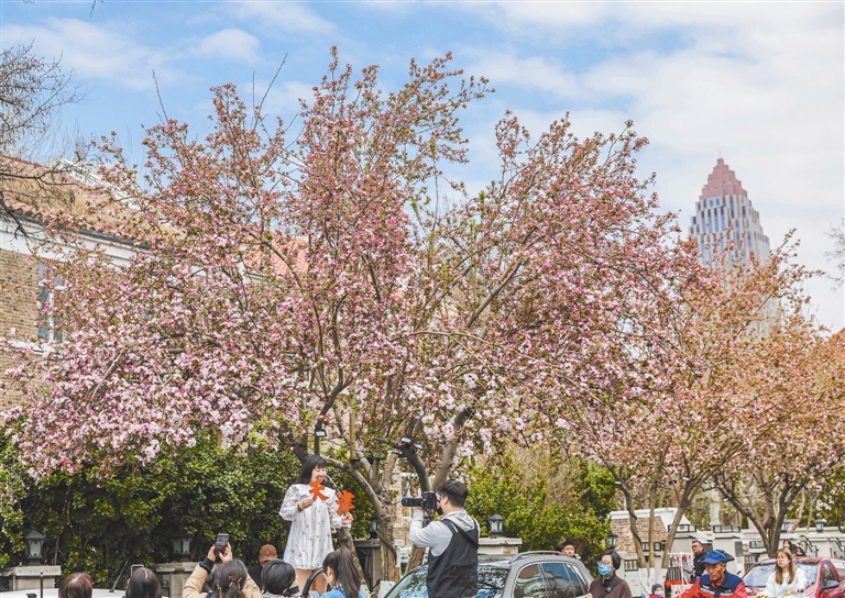 随着海棠花的陆续绽放,和平区“津遇和平·拾光海棠”——第四届五大道海棠花节将于4月3日至12日举行。活动期间将精心推出6大板块、123场演出、26处美陈,打造一场集艺术观赏、文化体验、消费购物、科技互动于一体的综合性春日嘉年华,让每一位游人乐享其中。图为大理道上海棠花陆续绽放,游客在海棠花下游玩、拍照。