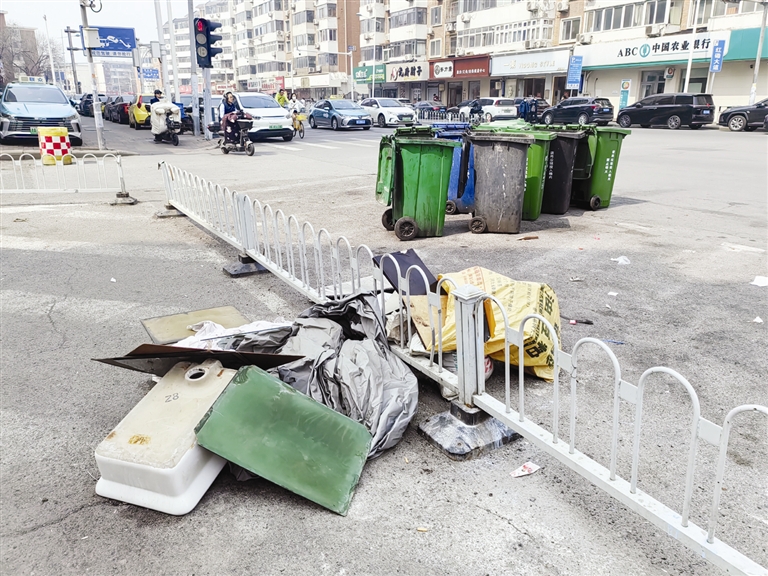 在广开四马路广云花园小区消防通道外,20个脏兮兮的垃圾桶横七竖八地摆放着,不仅占据了大半条非机动车道,还挤占了部分人行便道,甚至直接堵住了小区的消防通道。这些垃圾桶大多桶身破裂、盖子缺失。附近商户无奈地说,这些垃圾桶属于广云花园小区,长期摆放在这里,又脏又乱,来往市民都得绕着走,通行也受到影响,希望能尽快得到整治。