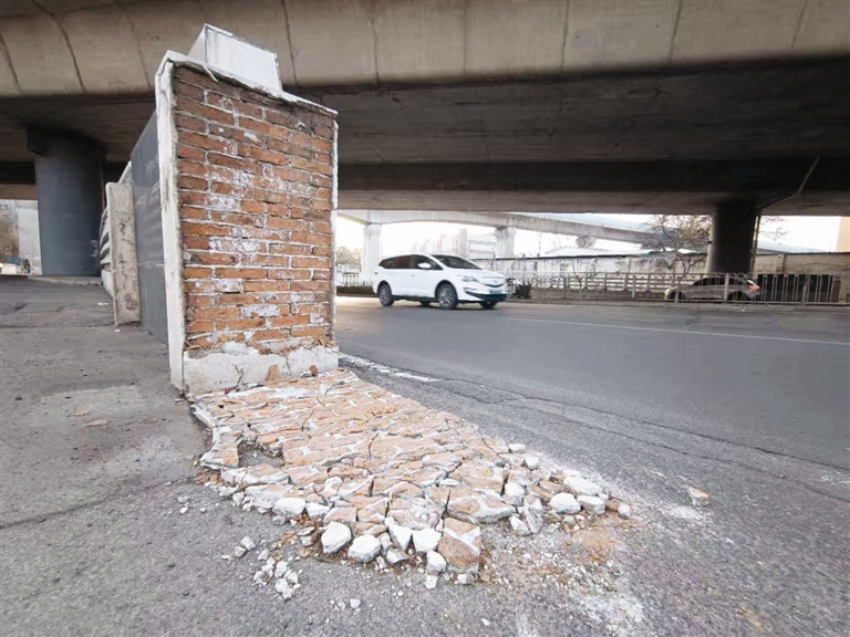 3月23日,记者赶到现场查看张先生反映的问题。金钟河大街自西向东由小树林地道上坡,去往王串场一号路方向的地道铭牌处,一个近1.5米高的装饰石砖整片剥落破损散落在地,裸露着红砖。记者观察到由地道自西向东去往金钟河东街方向的右拐车辆,由于拐弯角度过小,极易碰撞地道铭牌。过往市民希望相关部门对此处加以必要提醒,避免此类情况发生。