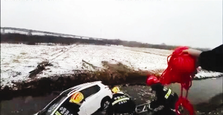 赶到现场后,眼前的情况印证了他们的判断:白色轿车已倾斜坠入排水沟中,积水淹没车身近二分之一,现场情况十分危险。民警第一时间联系消防部门,请求救援。