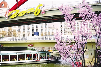 游船穿行在繁花与碧水之间,船上游客凭栏远眺,尽情欣赏两岸春色,不时按下快门,定格津城春日美景。
