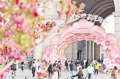 春风送暖,海棠缀巷。第四届五大道海棠花节今日启幕,静待游客在繁花之下,畅享春日浪漫时光。昨日已有不少游客在民园广场设置的多组海棠花主题美陈前合影。