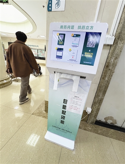 记者以患者身份询问柜台“有没有塑料袋”,得到的答复是“旁边有机器,扫码买”。记者发现这台塑料袋售卖机被放置在药房同侧的门诊大厅,与自助挂号机、水饮售卖机相邻,但也没有服务人员值守。