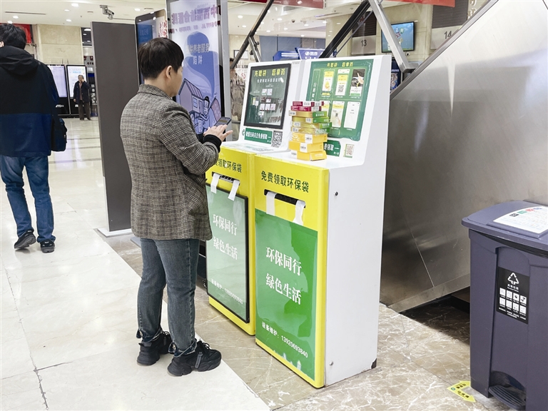 4月2日10时,记者来到南开医院,一楼药房窗口前,前来取药的市民有序排队,因药房不再提供一次性塑料袋,不少市民取完药品后只能捧着离开。药房对面的电梯旁,放着两台写有“免费领取环保袋”的设备,本是为解决市民装药需求设置,可现场使用情况并不理想。记者观察到,不少取药市民驻足设备前,有的仔细研读流程,有的尝试扫码操作,有些市民多次尝试仍未能领取成功。