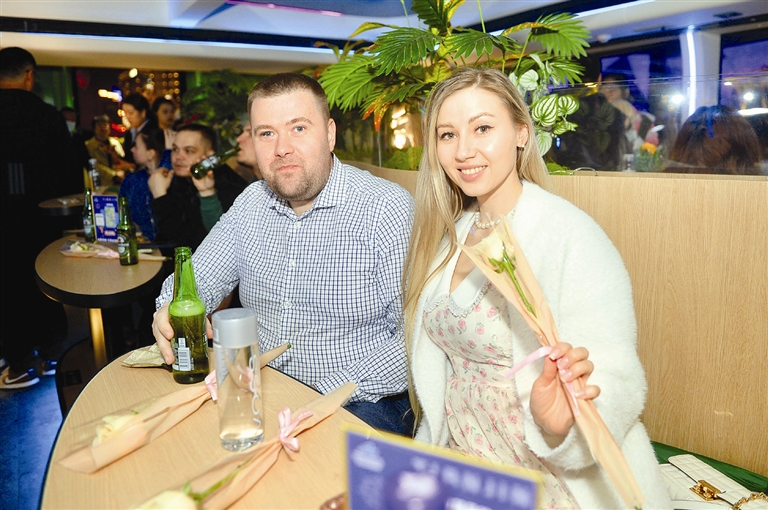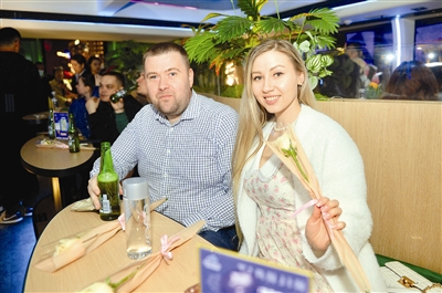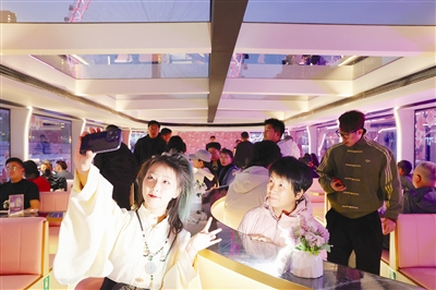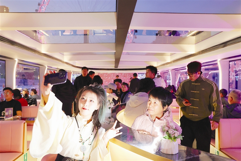 30分钟后,记者步入新纪元16号船舱。360度全景玻璃窗如春日画框,将海河两岸楼宇、桥梁、夜景无死角框入画中。船内打破传统游船“排排坐”的紧凑布局,两侧皮质沙发卡座、中间异形吧台桌椅错落排布,灯光柔和,氛围松弛。船舱前部的小舞台上,驻唱歌手唱着欢快的歌曲,彩灯随着歌声慢闪,氛围感拉满。游客们或倚窗观景,或围坐小酌,或用手机灯光呼应歌声,笑声、掌声交织,成为独属于海河之夜的浪漫记忆。“海棠船浪漫、清吧船松弛,外形都很时尚,完全‘踩’中年轻人的出游喜好。”“介似天津卫”博主王鹏旭一边拍摄一边分享,“从等待登船就一直在拍,充电宝都不敢离手。”