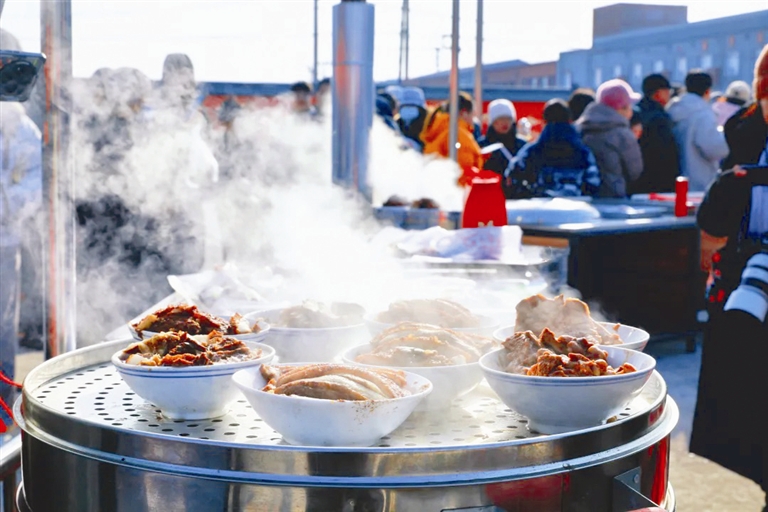打卡地2:“宁河第一锅”区域。一口大锅+八口小锅,核心大锅首次制作“青团”,应景又新鲜;周边小锅则端出酒曲馒头、酒酿片肉、传统丸子、野菜饺子、芦台春酱货、蒸五谷……地地道道的宁河味儿。
