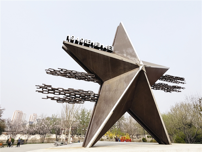 河北区绿宝石公园内,“光荣之星”雕塑巍然耸立——两颗耐候钢与不锈钢打造的五角星冲破铁链,大星铭记牺牲,小星寓意传承,与红色步道、主题石刻共同构成纪念空间。这座雕像定格了1949年“三分钟突破民权门”的战斗瞬间。