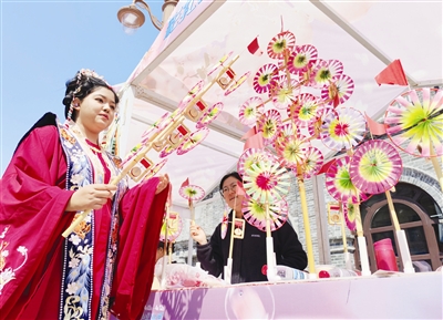 活动现场,非遗代表性传承人有的展示精湛技艺,有的指导游客互动体验。花丝镶嵌、皮影雕刻、绒花制作、草编技艺、秸秆扎刻等手工非遗作品精巧绝伦,吸引众多游客驻足观赏。来自沧州的周女士说:“我们一家人是因为海棠节特地来天津的,走过金街看到这个非遗展,孩子一看见就要体验,走不动了。”
