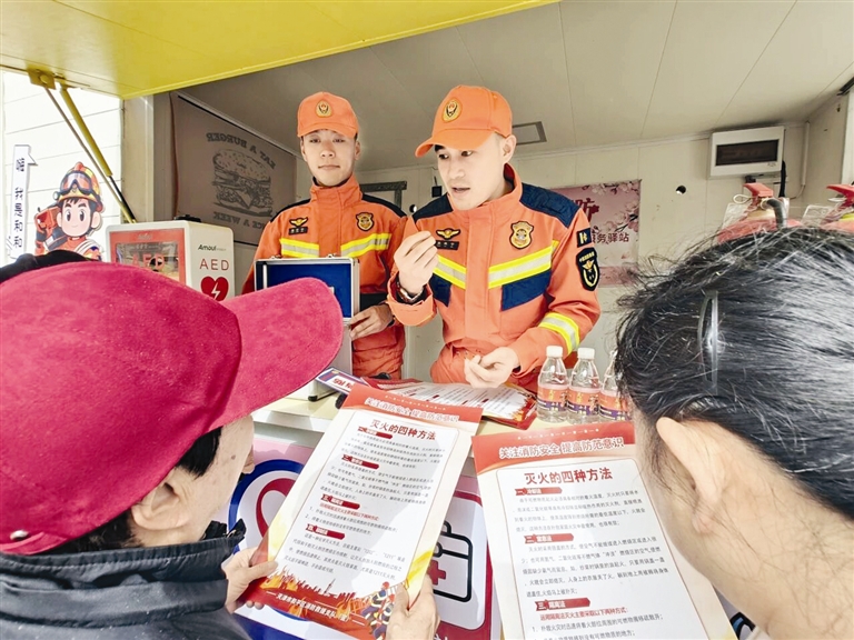 “大姨,这张宣传单给您,灭火的四种方法很实用。”消防员们“卖力”的讲解着。民园1920街区紧邻五大道赏花核心区,是本次海棠花节人流最密集的重点区域之一。和平消防精准对接赏花季群众需求,将驿站设在商圈核心点位,把消防安全阵地前移至群众身边。驿站既是海棠花节期间的前沿灭火备勤点,也是全天候的防火宣传站、便民服务站。