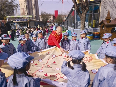 “小朋友,你们看,红军叔叔就是沿着这条弯弯曲曲的线,走了两万五千里。他们用鲜血和生命换来了我们今天的幸福生活。”多功能厅里,“最美五老”张励军老师展开一幅手绘长征路线图,孩子们围坐在他身旁,仰着小脸,目光紧紧跟着图上蜿蜒的红色箭头。从血战湘江到飞夺泸定桥,从四渡赤水到爬雪山过草地,张老师将历史化作鲜活故事。听到动情处,孩子们屏住呼吸,眼中满是崇敬。