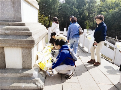 上午10时,队伍来到竹园公园烈士纪念碑前。松柏静立,碑文无声。全体人员低头默哀,深深三鞠躬。大家依次上前,把手里的手工花轻轻放在碑座四周,绕碑一周,细读碑文。