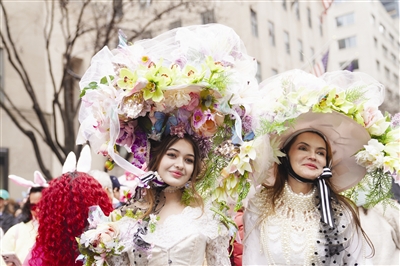 4月5日,纽约复活节帽子盛会在曼哈顿第五大道举行。参加活动的人们头戴造型夸张的帽子,将彩蛋、鲜花、兔子等复活节元素装饰在帽子上,庆祝节日和春天的到来。 新华社记者 张凤国 摄