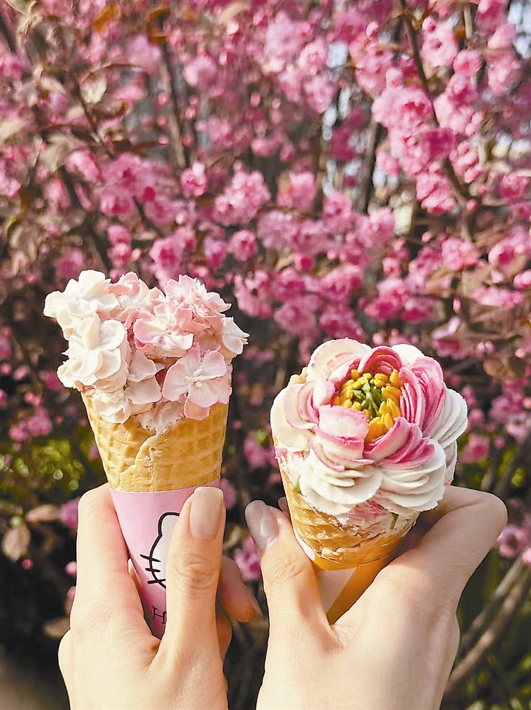 五大道上的“一念海棠花”冰激凌店,假期中始终排着长队。粉白渐变、花瓣乱真的海棠花冰激凌成为市民游客的“打卡拍照神器”。店主表示,这款冰激凌一天能卖出近千支,海棠花节首日的营业额已经过万元,而五大道上的一家文创店,则以设计师设计的天津元素和海棠元素冰箱贴实现消费者的翻倍。