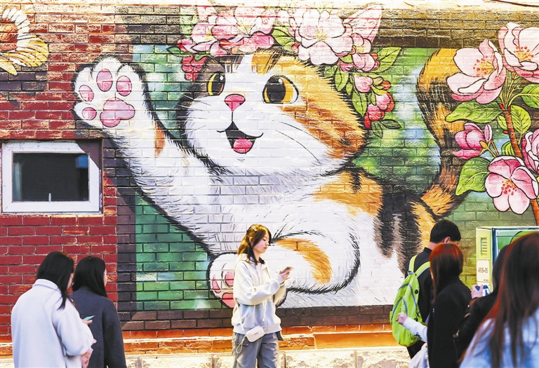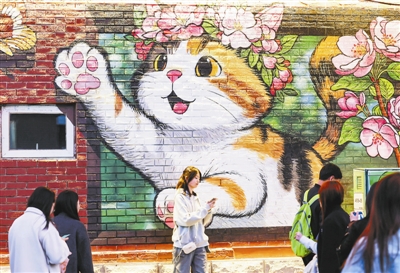 树洞里的“小猫”冒出了头,伸出小爪子“Say Hi”,墙面上的花猫和海棠一起,萌萌地招呼着过往的游客。这个清明假期,五大道公园街边的墙面和路边的树洞多了不少可爱的猫猫,成为海棠树下市民游客新热门打卡地。清明前夕,记者在五大道公园见到了正在树下作画的自媒体创作者“思睿画一个”,她告诉记者,自己用小猫和花朵“填补”公园附近树木的树洞,源自对天津美的感叹,“天津太美了,我们画出这些‘小可爱’,目的是想让这个春天的城市更美。”听到路过的孩子们和大姨的啧啧称赞,组团拍照,“思睿画一个”表示,这是对自己作品最大的肯定。