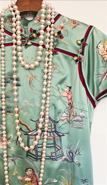 如今,这份跨越百年的时尚传奇,在顾维钧旧居中得以精准复刻。旧居二楼开辟了专属空间,陈列着一件曾惊艳世界的百子嬉春图旗袍复刻件。据吴越世家的主理人吴越女士介绍,旗袍原件出品于1932年,湖蓝色的面料上刺绣有中国龙、亭台楼阁及百子嬉戏。中式的图案借鉴了西方艺术的表现形式,是中西方审美的典型代表。“黄蕙兰1932年以高价购得这件旗袍,1943年,她身穿这件旗袍登上《Vogue》杂志封面,成为跨越时代的经典。”吴越表示,这件旗袍的纯手工复刻耗时近一年,从面料甄选、色彩校准,到每一针刺绣、每一寸剪裁,都力求还原原版神韵,将当年的匠心与雅致尽数延续。与此同时,工作室专为海棠季打造的绒花、手帕、首饰等文创产品,都嵌入了时尚基因,契合当代年轻人的审美偏好。