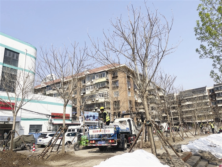 昨天上午在南开区临汾路上,临近菜市场的一块绿地里,施工人员正在忙着各自手中的工作,有些人忙着给新栽的树木浇水,同时也给施工区域洒水降尘,还有部分施工人员在铺设砖石。临汾路的周边同样分布着居民区,既有老旧居民区也有新建的商品房小区。但是,无论是西营门外大街,还是周边的几条道路,虽然行道树不少,却没有口袋公园等供居民休闲的场所。正在施工的这片绿地,就是根据居民的诉求,要改造成口袋公园,名字就叫做临汾公园。