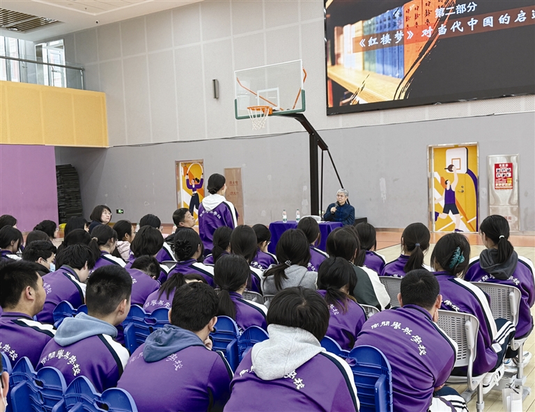 4月8日下午,中国红楼梦学会副会长、天津市红楼梦研究会会长、天津师范大学博士生导师赵建忠教授,在天津市南开区誉英学校篮球馆内举办了一场题为“《红楼梦》整本书与碎片化阅读”的专题讲座,引导在场师生回归文本细读,探寻《红楼梦》的深层奥秘,并与学生现场交流。