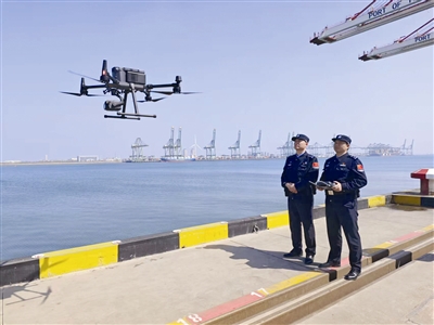 有了地面的固定岗亭和移动巡逻车,空中管控也丝毫不落下。顺着民警手指的方向,大家看到口岸智能防控的空中哨兵——警用无人机,它和智能岗亭、智能巡逻车形成互补,让边检机关真正实现了港口服务管控的空天地一体化,也是深化科技应用、弥补高空管控盲区的关键布局。