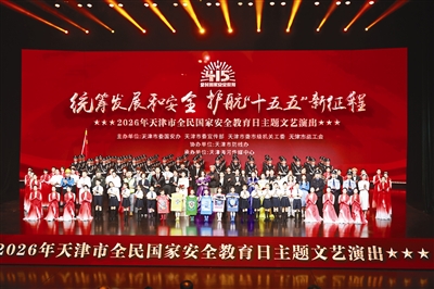 整场文艺演出坚持以总体国家安全观为指引,聚焦“统筹发展和安全 护航‘十五五’新征程”主题,分为“山河如故 警钟长鸣”“全民防线 人民至上”“新的远征 护航未来”3个篇章,通过沉浸式话剧、情境歌舞、音舞诗画剧等多种艺术形式,生动诠释了总体国家安全观的深刻内涵,展现了天津作为“畿辅首邑”筑牢首都政治、安全“护城河”的使命担当。演出在开场短片《津门百年警钟》和情境歌舞《征鼓》中拉开帷幕,激昂的鼓点瞬间将观众带回了那段波澜壮阔的历史岁月。沉浸式话剧《潜伏风云》片段,再现了隐蔽战线英雄们把名字藏进风里、用生命捍卫信仰的无声功勋,令现场观众深受触动。在“全民防线 人民至上”篇章中,歌舞《让中国更美丽》、音舞诗画剧《平凡的卫士》以及原创歌曲《我在你身旁》等节目,深情讴歌了各行各业守护者将安全意识融入日常、化为行动的平凡坚守。情境讲述《看不见的战线》则深刻揭示了新时代国家安全面临的复杂挑战,展现了维护国家安全的决心与力量。整场演出在仪式仪仗表演与歌舞《护航未来》《承诺》中推向高潮。演出最后,全场起立高唱《歌唱祖国》,激昂的旋律响彻剧院,表达了全市人民在“十五五”开局之年,统筹发展和安全,为护航中国式现代化新征程贡献力量的坚定信念。