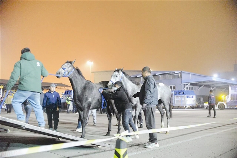 航班落地后,天津滨海机场物流公司保障团队高效联动、密切配合,严格遵循“低噪音、低应激”作业规范,全程轻装轻卸、平稳有序转运。机场海关、边防检查站高效开展现场查验,合力实现活体动物进境“零延时”通关。从卸机、暂存、手续核验到提货装车,各环节无缝衔接、高效流转,实现“机下直转、场院直装”,最大限度缩短中转停留时间,全力保障马匹健康状态。由于前期准备充分、现场保障到位,在海关、边防检查站及机场相关单位的通力协作下,该航班仅用40分钟便完成卸机操作。