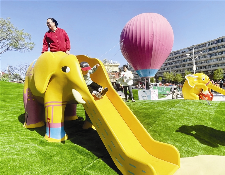 昨日,“大象滑梯乐园”亮相河东区井冈山路城市更新项目现场,让人们重回童年时光。
