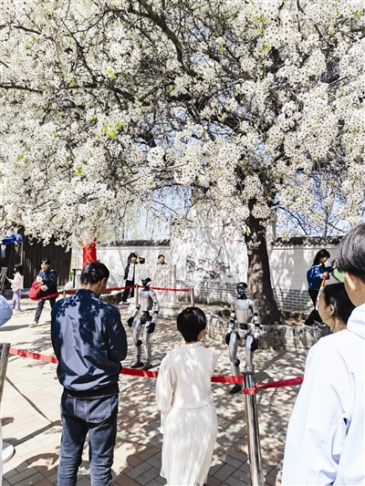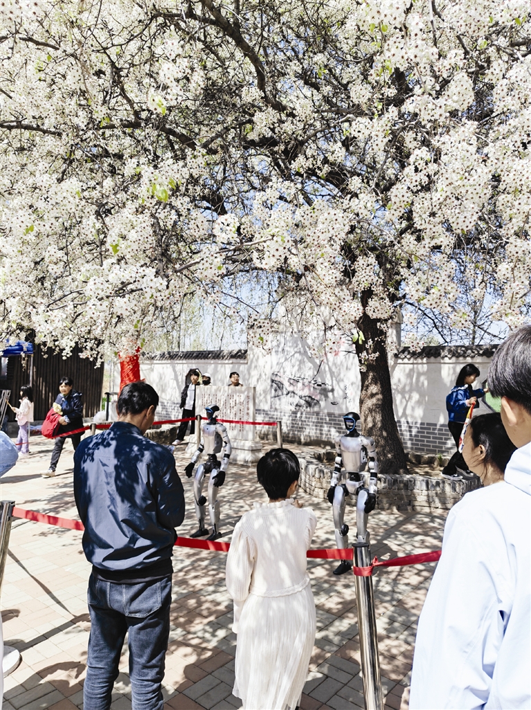 另一边,一株有着两三百年历史的杜梨仙树下,两名AI机器人正在热舞,吸引大批游客观看。表演结束后,两名机器人走出表演区,与孩子们互动起来。“妈妈,机器人跟我握手了!”三岁的小石头跟机器人互动后开心地扑到妈妈怀里。旁边几个孩子陆续围到机器人身边,尝试打招呼、握手,甚至有的小朋友跟机器人拼起舞来。