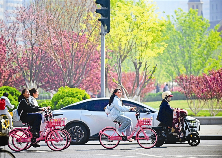 粉紫单车映海棠 津城春日骑行添新景