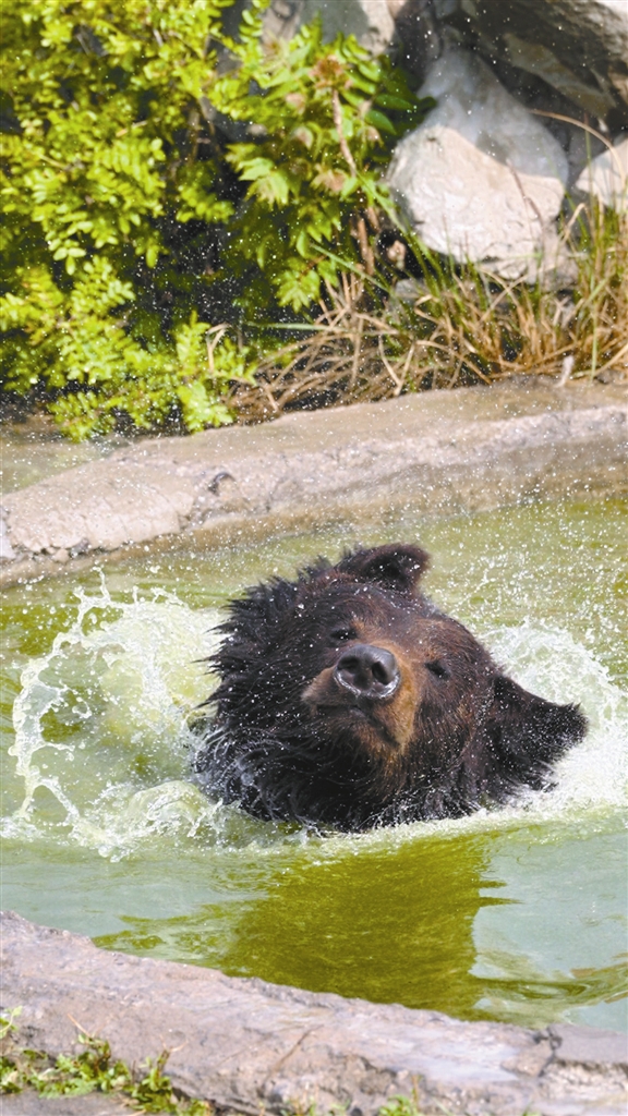 熊山那边同样热闹,黑熊趁着天暖,开启了水池“泡澡”的惬意时光,它可太“灵”了,先是用爪子拍水玩,然后才试探着慢悠悠把整个身体浸入水中,马上露出的舒服模样,让游人羡慕。“这黑熊也太会享受了,跟咱们泡温泉似的,太惬意了!”游客们围着熊山拍照,记录下这慵懒又可爱的瞬间。