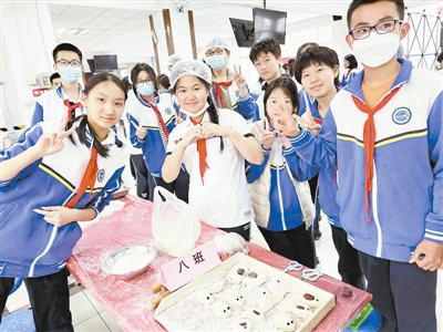 雪白的面粉揉成面团儿,做成的饺子整齐排列,花朵、动物等造型的面食创意十足……近日,在天津外国语大学附属外国语学校的校园里,一场“面团大赛”展示着孩子们的动手能力,也是学校劳动教育与中华优秀传统美食文化相融合的有益呈现。