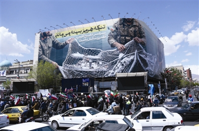 伊朗首都德黑兰革命广场的大幅宣传画上展示着伊朗武装人员的形象,文字内容是“霍尔木兹海峡仍然关闭 整个波斯湾都是我们的猎场”。 新华社记者 沙达提 摄