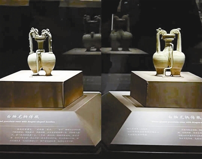 此次展出的隋白釉双龙柄联腹传瓶,可称为天博“镇馆之宝”之一。盘口、单颈、双腹相连,连接处有两个环形系。肩左右两侧各塑一条修长的龙形柄,龙头探入瓶口,好像在贪婪地吸吮瓶中的玉液琼浆。双龙柄为手工捏塑而成,手法简单干练,形象生动逼真。