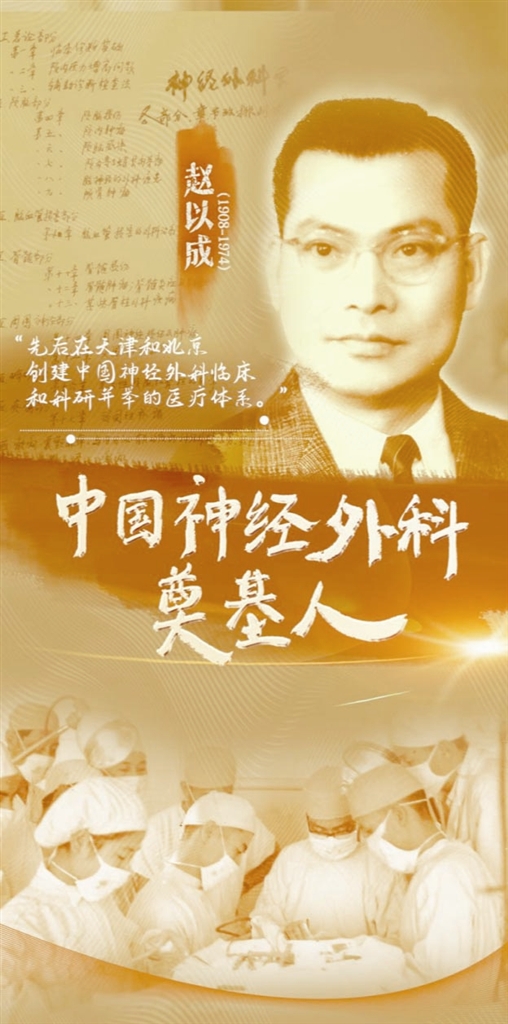 1952年,赵以成在天津医学院附属总医院创建中国第一个独立神经外科(脑系外科),正式开启中国神经外科专业化发展序幕。1953年,他在天津创办全国神经外科进修班,亲自编写教材、授课育人,培养大批高层次神经外科人才,推动全国各地神经外科学科建立与发展,天津也因此成为“中国神经外科的摇篮”,赵以成被尊称为“中国神经外科之父”。