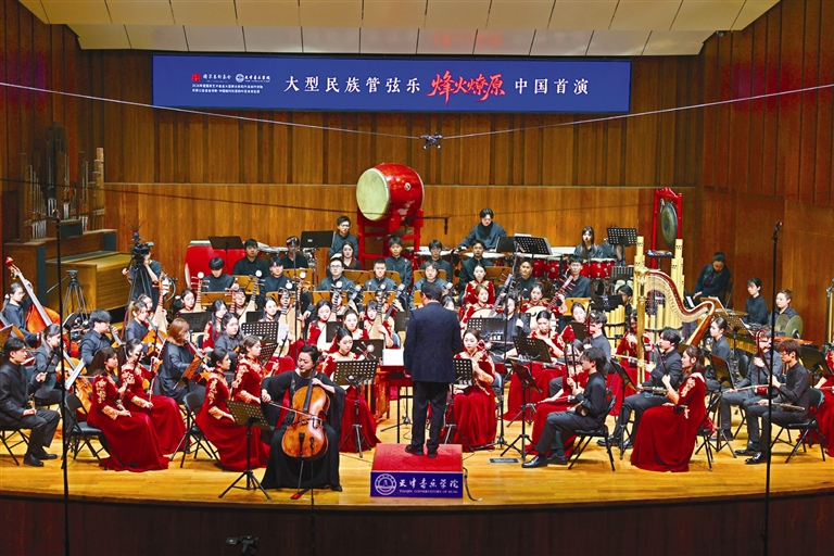 昨晚,天津音乐学院音乐厅内,大型民族管弦乐《烽火燎原》迎来中国首演。作为2026年度国家艺术基金大型舞台剧和作品创作资助项目,天津音乐学院主办的大型民族管弦乐《烽火燎原》中国首演昨晚于天津音乐学院音乐厅成功上演。本场演出由青年作曲家臧婷作曲,著名指挥家、天津音乐学院作曲指挥系主任张海峰执棒,管弦系主任王斯雯担任大提琴独奏,歌剧学院张喜秋教授担任男高音独唱,天津音乐学院青年民族管弦乐团担纲演奏。作品以恢弘厚重的民族音乐语言,全景式再现抗日战争烽火岁月,奏响不屈的民族精神赞歌。