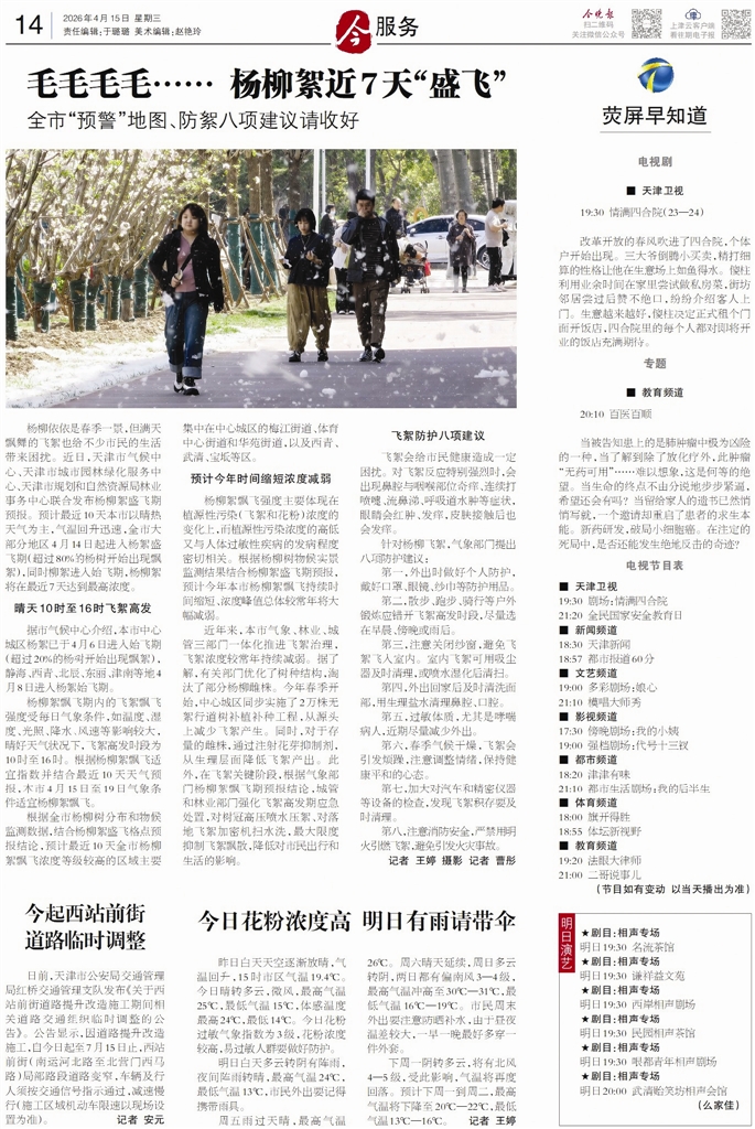 根据有关部门发布的预报,预计今年本市杨柳絮飘飞持续时间会缩短,浓度、峰值总体较常年也将大幅减弱。