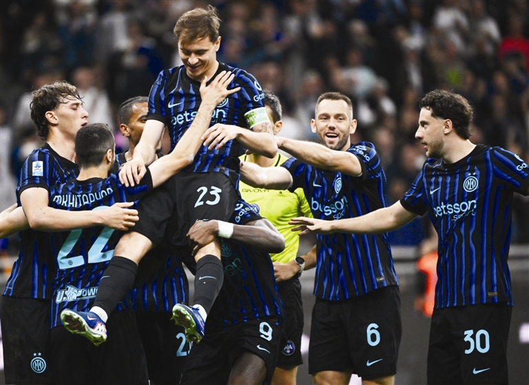 北京时间昨天凌晨,国际米兰队在意甲第33轮中3比0轻取卡利亚里队,提前5轮锁定意甲前4,获得下赛季欧冠正赛资格,距离夺冠也仅有一步之遥。图为国际米兰队球员巴雷拉(上图上)与队友庆祝进球。新华社发