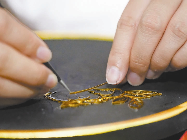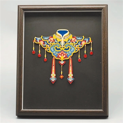 小袁是一位在今年年初才在“创美”就业的新员工,零基础入门的她,因对胶水过敏,双手起满红疹,又痒又肿,仍咬牙坚持。这次订单中的“云肩”点蓝相框,是她接到的第一个大任务。面对纹样繁复、极易串色的“云肩”相框,她总结出自己的方法:先填大色块,再精细处理细小区域,等一色干透再衔接下一色,还借鉴前辈经验加水调釉,让色彩更均匀平整。