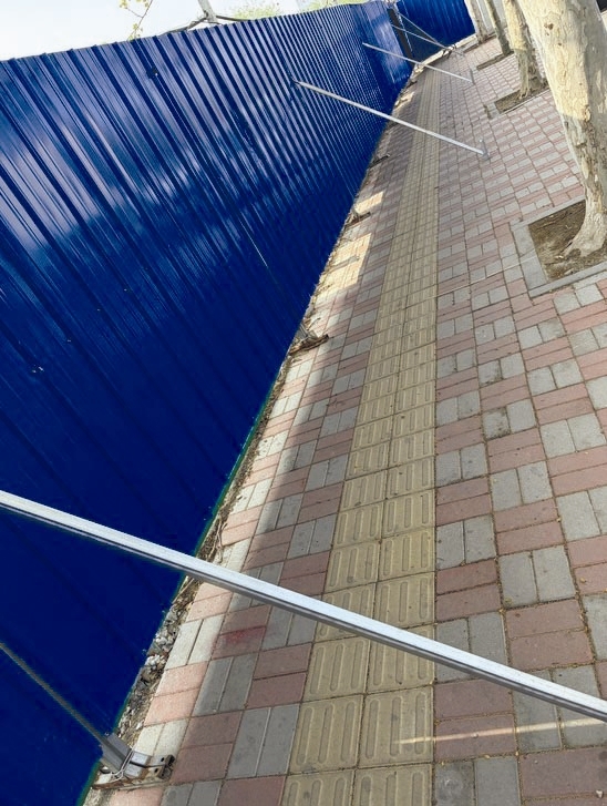 4月13日,记者来到东丽区格兰苑小区,在新明路与智通道交口附近看到,便道一侧被蓝色铁板围住,长近两米的银色铁管斜立在盲道正上方,用以支撑蓝色铁板。银色铁管与地面衔接处,还有突出地面十多厘米的“铁钉”,整条便道几乎被占满且“机关重重”。“这让人还怎么走。”附近居民说。