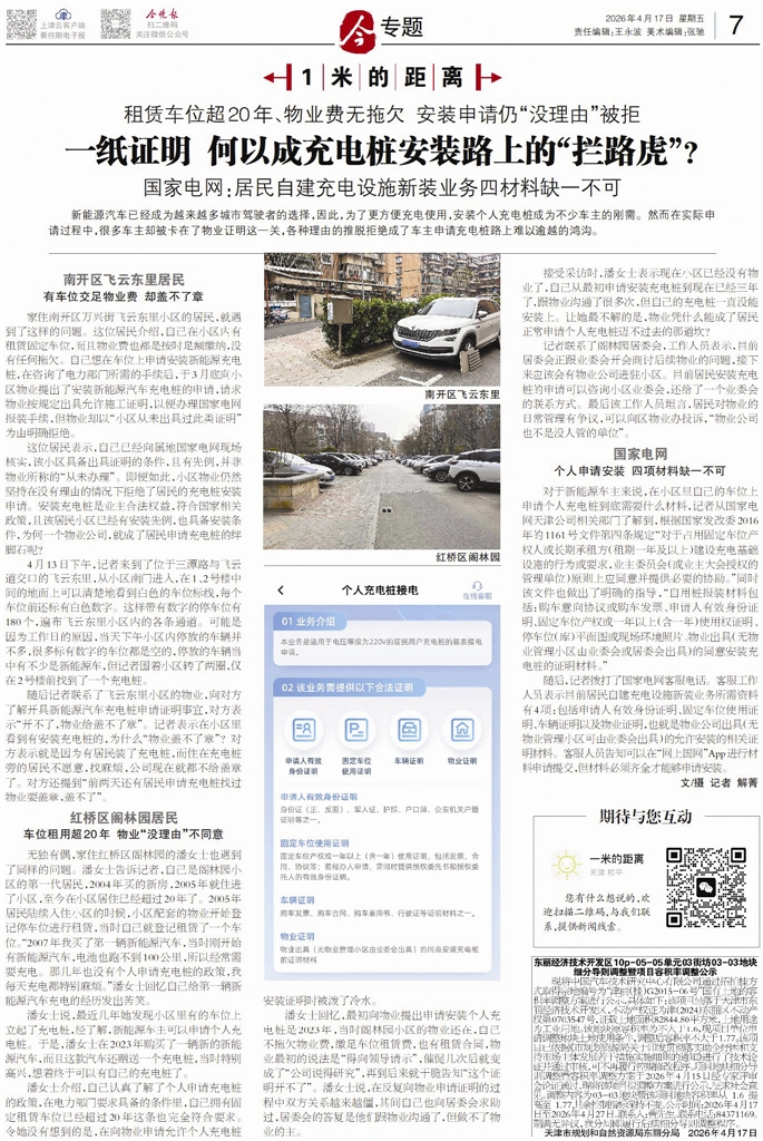 4月17日,本报“1米的距离”刊发《一纸证明 何以成充电桩安装路上的“拦路虎”?》专题报道,关注阁林园小区业主申请新能源汽车充电桩在物业证明环节受阻的问题。昨日,业主潘女士联系记者带来喜讯,在居委会协调协助下,该小区业委会已正式在其充电桩安装申请书上完成盖章,为后续充电桩落地迈出关键一步。